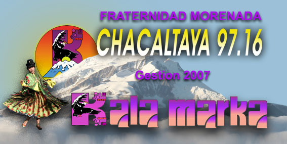 Tema: Impomente y señorial moreno IMPONENTE y SEÑORIAL MORENO Morenada KalaMarka: H. Gutierrez - R. Choque Chacaltaya Chacaltaya si señor 2007 Jallalla Imponente y señorial moreno hacia la Virgencita del Carmen Imponente y señorial moreno Jallalla Jallalla Chacaltaya El amarillo del Sol refleja el blanco nevado mensajero milenario llegas hoy Chacaltaya Imponente y señorial moreno a mi Virgencita del Carmen Imponente y señorial moreno Jallalla Jallalla Chacantaya Hijos del hielo, hijos del viento sangre aymara oh Chacaltaya 97 punto 16 Ju Ja Jujaja .